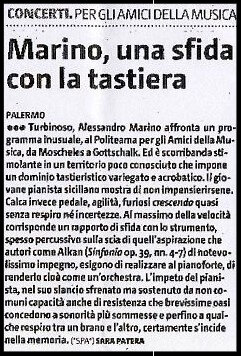 "Turbinoso, Alessandro Marino affronta un programma inusuale, al Politeama per gli Amici della Musica, da Moscheles a Gottschalk. Ed è scorribanda stimolante in un territorio poco conosciuto che impone un dominio tastieristico variegato e acrobatico. Il giovane pianista siciliano mostra di non impensierirsene. Calca invece pedale, agilità, furiosi crescendo quasi senza respiro né incertezze. Al massimo della velocità corrisponde un rapporto di sfida con lo strumento, spesso percussivo sulla scia di quell’aspirazione che autori come Alkan ( Sinfonia op. 39, nn. 4-7) di notevolissimo impegno, esigono di realizzare al pianoforte, di renderlo cioè come un’orchestra. L’impeto del pianista, nel suo slancio sfrenato ma sostenuto da non comuni capacità anche di resistenza che brevissime oasi concedono a sonorità più sommesse e perfino a qualche respiro tra un brano e l’altro, certamente s’incide nella memoria."